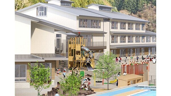 川上村では、吉野林業発祥の村にふさわしい、木材をふんだんに用いたぬくもりのある複合施設を建設中です。ここには、義務教育学校、保育園や学童保育所などの子育て支援施設を集約しており、これらをつなぐ役割として、川上村の全ての子育て親子が集うことのできる「子育て支援の場」をつくります。