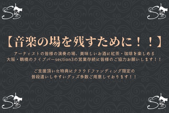 大阪・鶴橋にあるライブバーsection3です!!コロナで売上が落ちる中、様々な対策を講じております!!しかし限界は来るもので、section3運営継続のために...