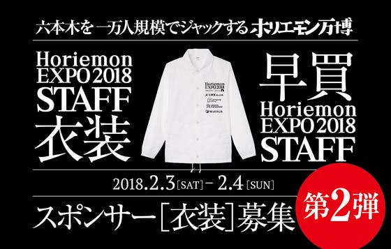 ホリエモン万博にてスタッフが着用するナイロンジャケットのスポンサーを募集しています!!また早めに着用して集客に繋げたいと思っている「有志」に向けたクラウドファン...