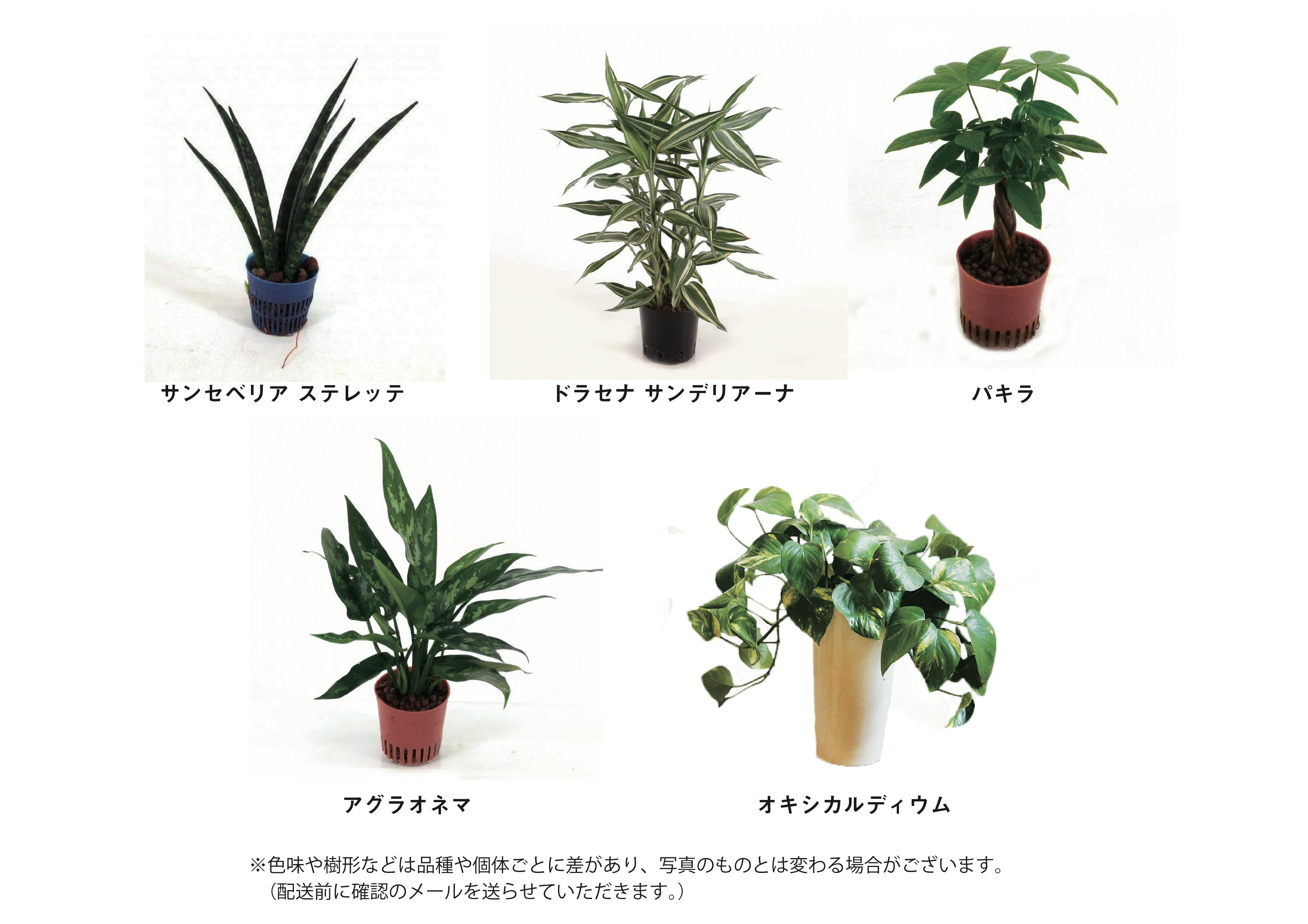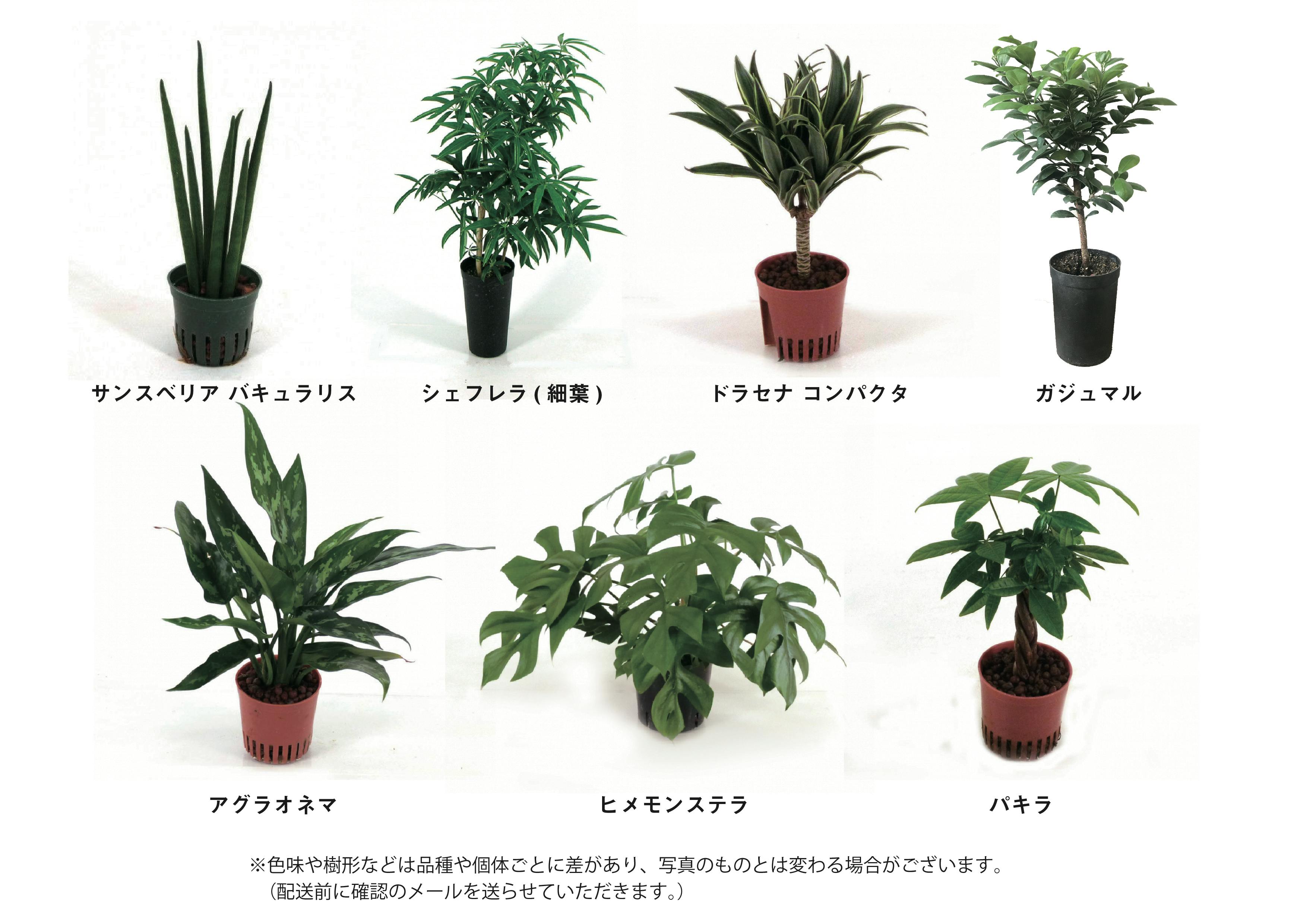 種類_ヒメモンステラ/サンスベリア バキュラリス/ガジュマル/アグラオネマ/ドラセナ コンパクタ/パキラ/シェフレラ(細葉)