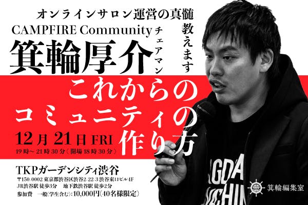 これからのコミュニティオーナー同士の活性化を図り、日本国内のオンラインサロンの発展を目的とした試みとなりました。当日は国内トップクラスのオンラインサロンを運営する『箕輪編集室』の箕輪厚介氏に登壇していただき、実体験でしか会得できない運営技術やノウハウを学ぶことができます。もちろん「オンラインサロンに興味がある」という方でも大歓迎です!