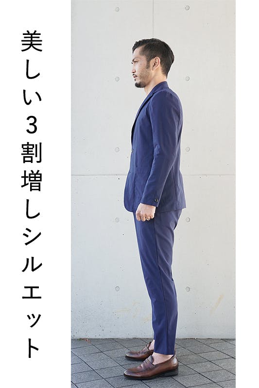 セットアップで着用した際にスマートなイケてるビジネスマンに見える様に、そしてビジネスシーンでも失礼のない様に、綺麗目なシルエットになっています。