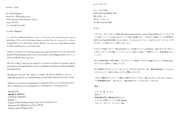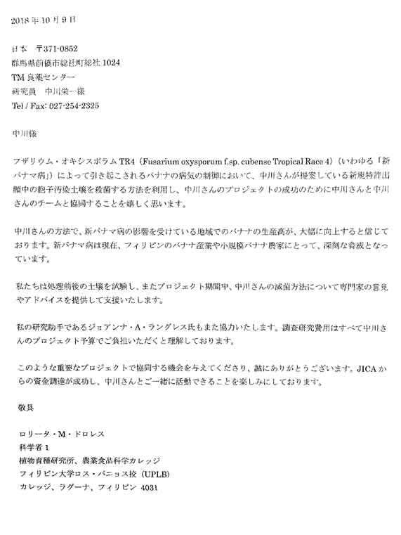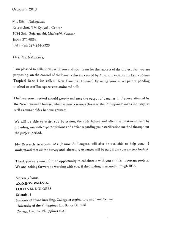 東京大学農学部門、植物病理学の志柿俊朗農学博士もこの計画に共同参画しています。先生は熱帯地域の植物の病気を長く研究されています。更にフィリピン最高水準の国立フィリピン大学ロスバニョス校(農学部所在地)の博士(Dr. Doloresほか)も協力していただけます。 ドロレス博士からの英文と訳文参照してください。