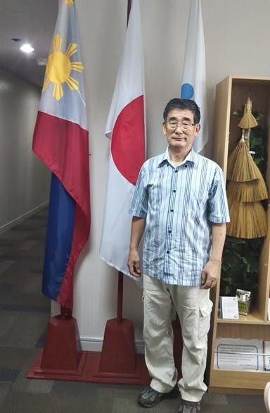 写真1. 日本、フィリピン両国国旗とJICAマニラ事務所を訪問した考案者兼計画者 中川栄一