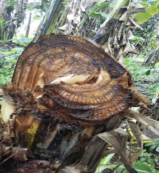 汚染発症のバナナ茎葉は伐根、伐採後焼却します。