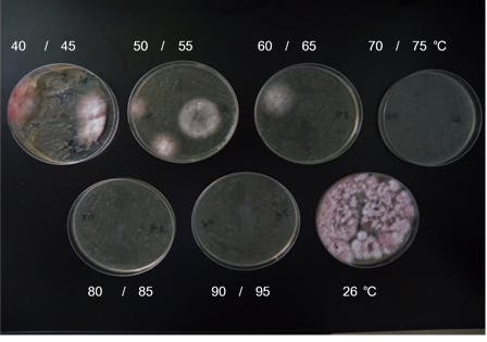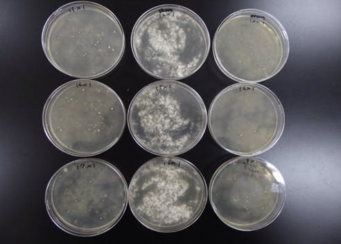 土壌加熱処理後の対象菌の減少状態 下段 右 加熱してない繁殖状態