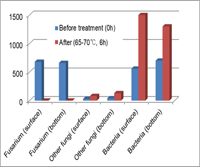 宮越農学博士のレポートにあるように、この考案は無農薬であり、加熱温度帯では対象有害菌は浄化されますが、栽培土壌にとって有用な枯草菌などの有用菌が増殖して土壌が豊かになります。抗菌保護膜は菌の再侵入汚染を抑制します。