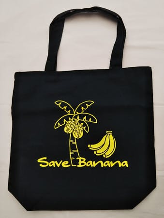 1口5,000円ご支援いただいた皆様にはSAVE BANANA独自ロゴ入りデニム製トートバッグ(サイズ36 cm×37 cm×11cm)とご支援の礼状をまず、送らせていただきます。さらに、作業実施報告写真を開始前段階、浄化段階、苗植え付け段階、生育段階、結実段階の写真を送らせて頂きます。