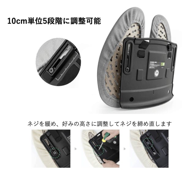 左右のサポートだけでなく、上下のサポートも体型や身長に合わせてカスタマイズできます。パーツ取り付け部のネジ止めを操作して、5段階10cm単位でパッドの高さ調節可能。
