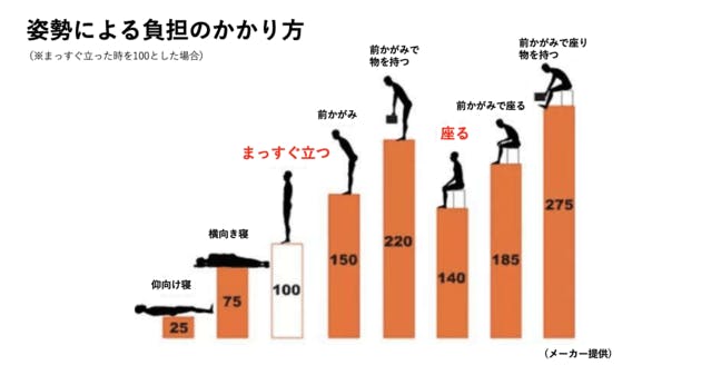 体重約70kgの成人男性の場合、リラックスした姿勢で約3kg、仰け反り気味だと約4kg、やや前傾した状態で約6kgの負担がかかっています。姿勢が悪いだけで、腰への負担は倍にもなるんです。