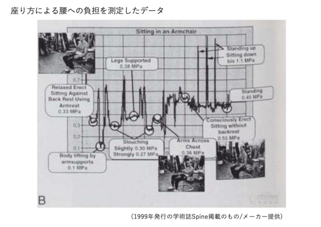 以下のデータでは、座った時の姿勢によって腰にどの程度負担がかかるかが掲載されています。