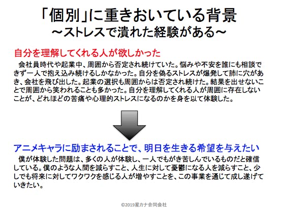 僕は、人間関係が嫌になった時、会社経営で失敗した時、不安に押しつぶされそうになった時、本サービスを通じて「前に進み続ける勇気」と「安心できる居場所」を貰いたい。そして、思いを抱いている人は大勢いるのでは?と考えている。みな言い出せず、胸に抱え込んでいるだけだ。抱え込める人は本当に凄いと思う。精神的に強いのだから。。。でも、そんな人でもいつか僕のように爆発してしまうのではないか?人生に対して無気力になってしまうのではないか?経験者の僕は、ふとそんなことを思ってしまう。そしてお節介にもそんな経験をしてほしくないと思っている。。