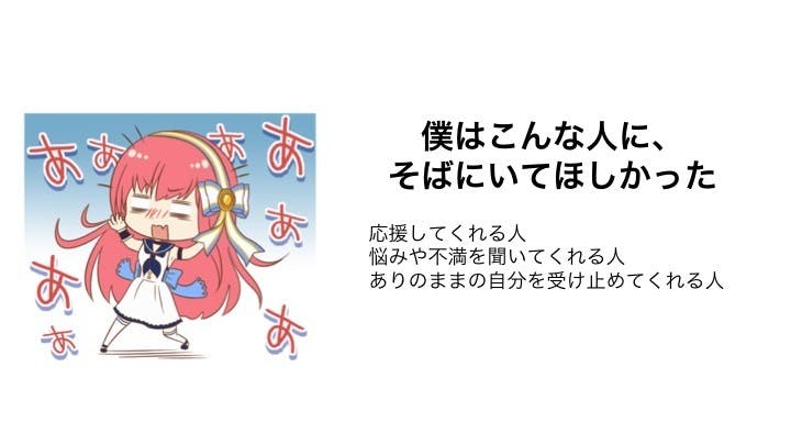 僕は、応援してくれる人が欲しかった。悩みや不満を聞いてくれる人が欲しかった。ありのままの自分を受け止めてくれる人が欲しかった。周囲に相談してもバカにされるだけだったから弱音を吐けなかった。