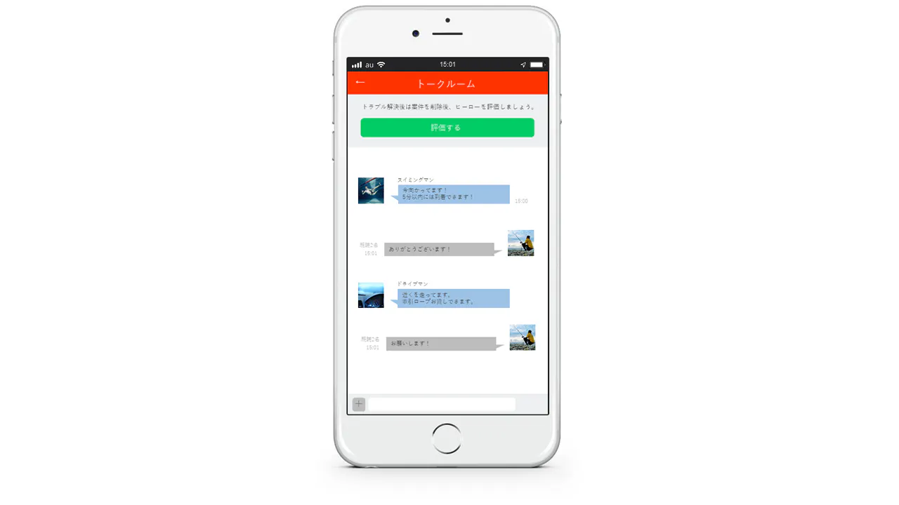 以上が主要機能のイメージとなり、ヒーローの活躍によりトラブルが解決した場合は、ユーザーがヒーローの評価を書いて終了です。多くのトラブルを解決したヒーローはランキング形式で掲載いたします。