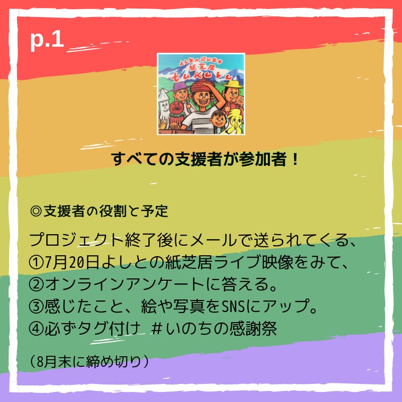 紙芝居と絵本の制作・紙芝居ライブ映像と絵本のデータ制作・ホームページ制作費・リターン仕入れ費と送料・キャンペーン分を除くクラウドファンディンングの手数料・7月20日のいのちの感謝祭運営費・顧問料・場所代・広告費・よしと氏・島根チームの交通費・宿泊費・謝礼などに充てさせていただきます。