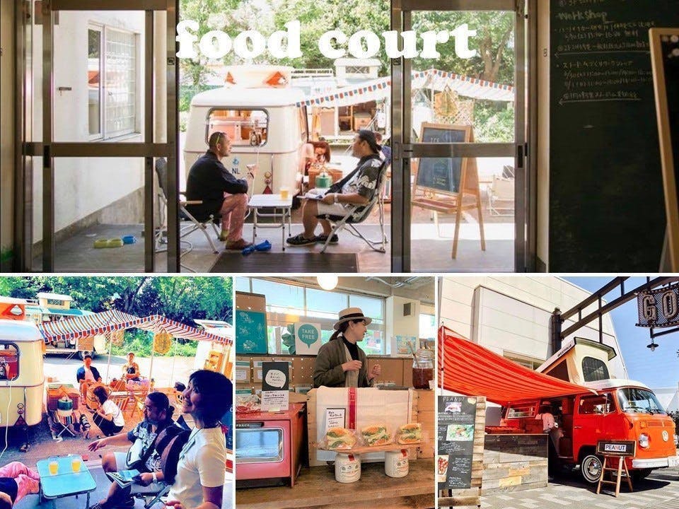 キッチンカーはパーキングエリアスペース、フードエリアはエントランス外側(雨天時室内)。マルシェ、フリマ、ワークショップは室内となりますので、雨天時も開催します。