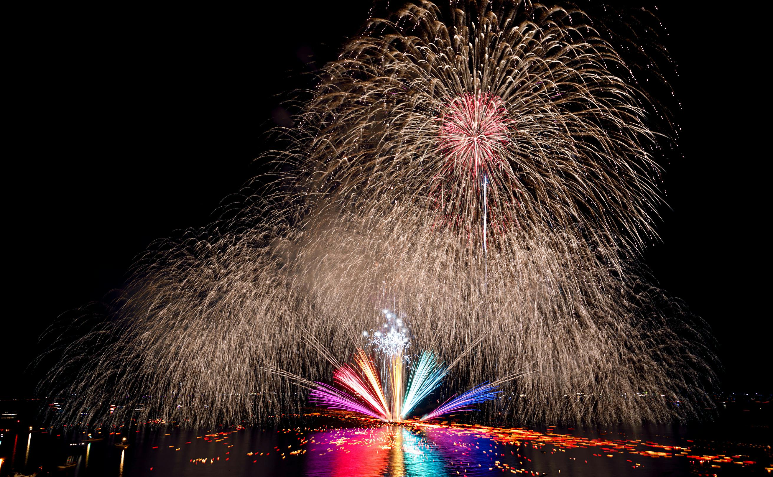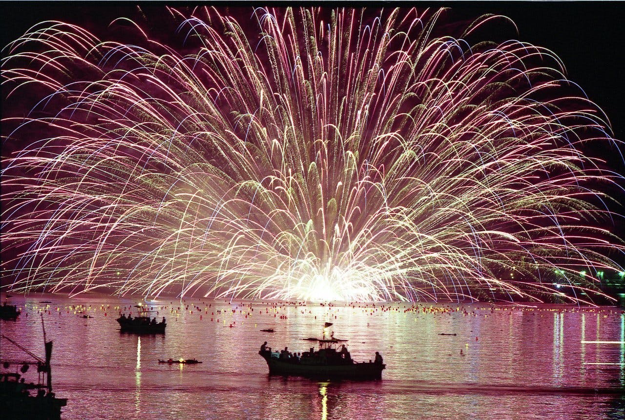 ●燈籠流しとともに、鉄道が開通した大正13年から花火を打ち上げた始めたのが現在まで続いています。日本三大燈籠流しの一つとして毎年8月16日に宮津湾一帯で行われる当市最大の催しです。