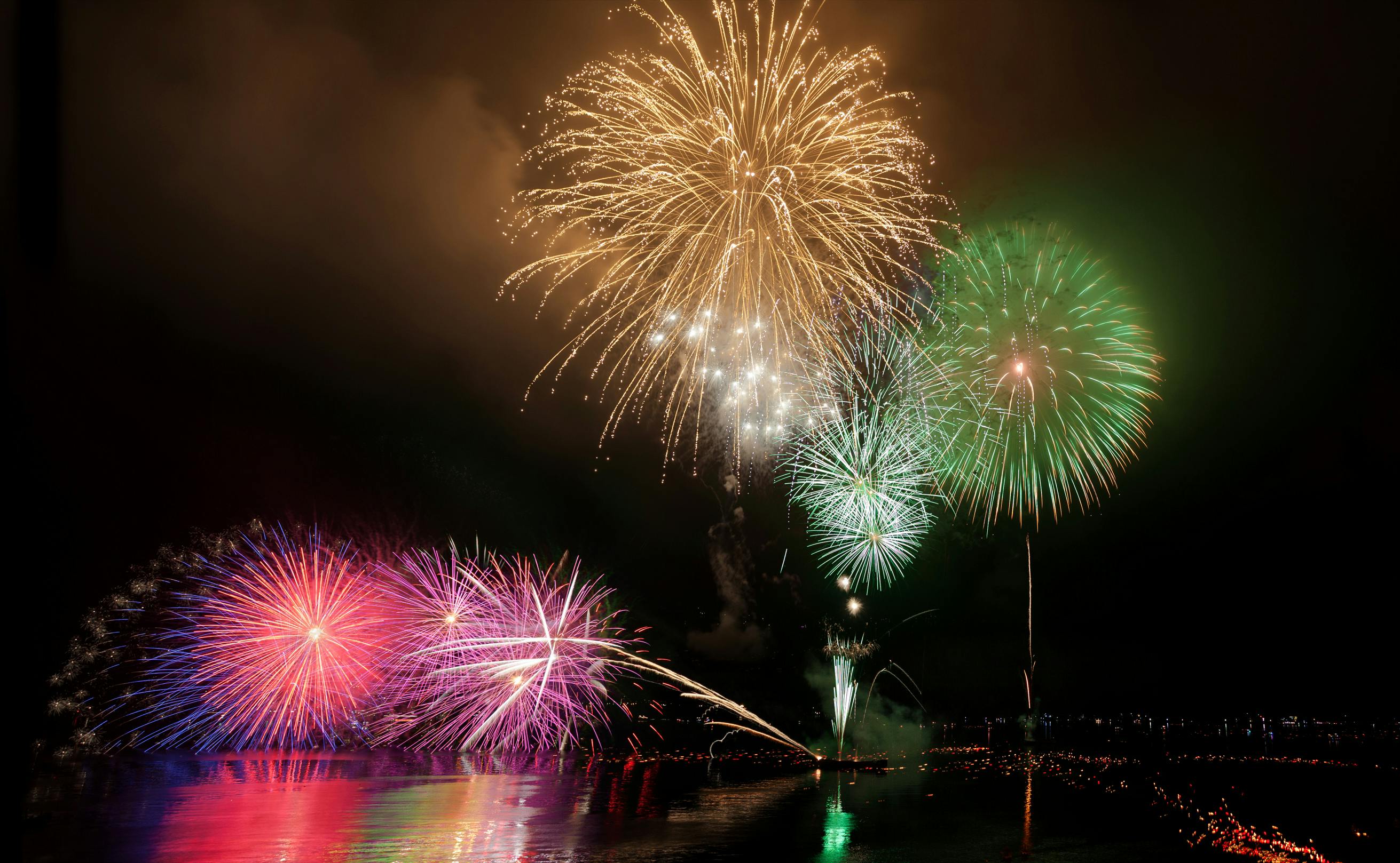 約400年の歴史を持つ燈籠流しとともに花火が打ち上げられる、宮津燈籠流し花火大会。毎年8月16日に開催される宮津市最大の伝統行事です。