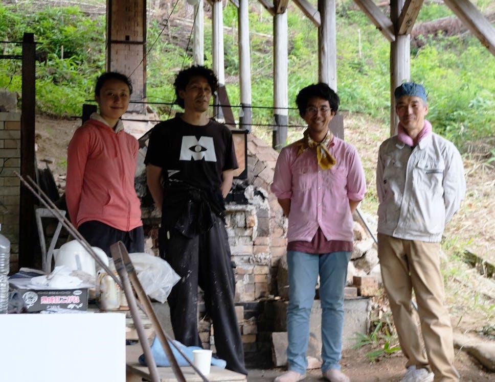 [この夏、薪窯を一緒にやった講師仲間と教室出身の陶芸家と]