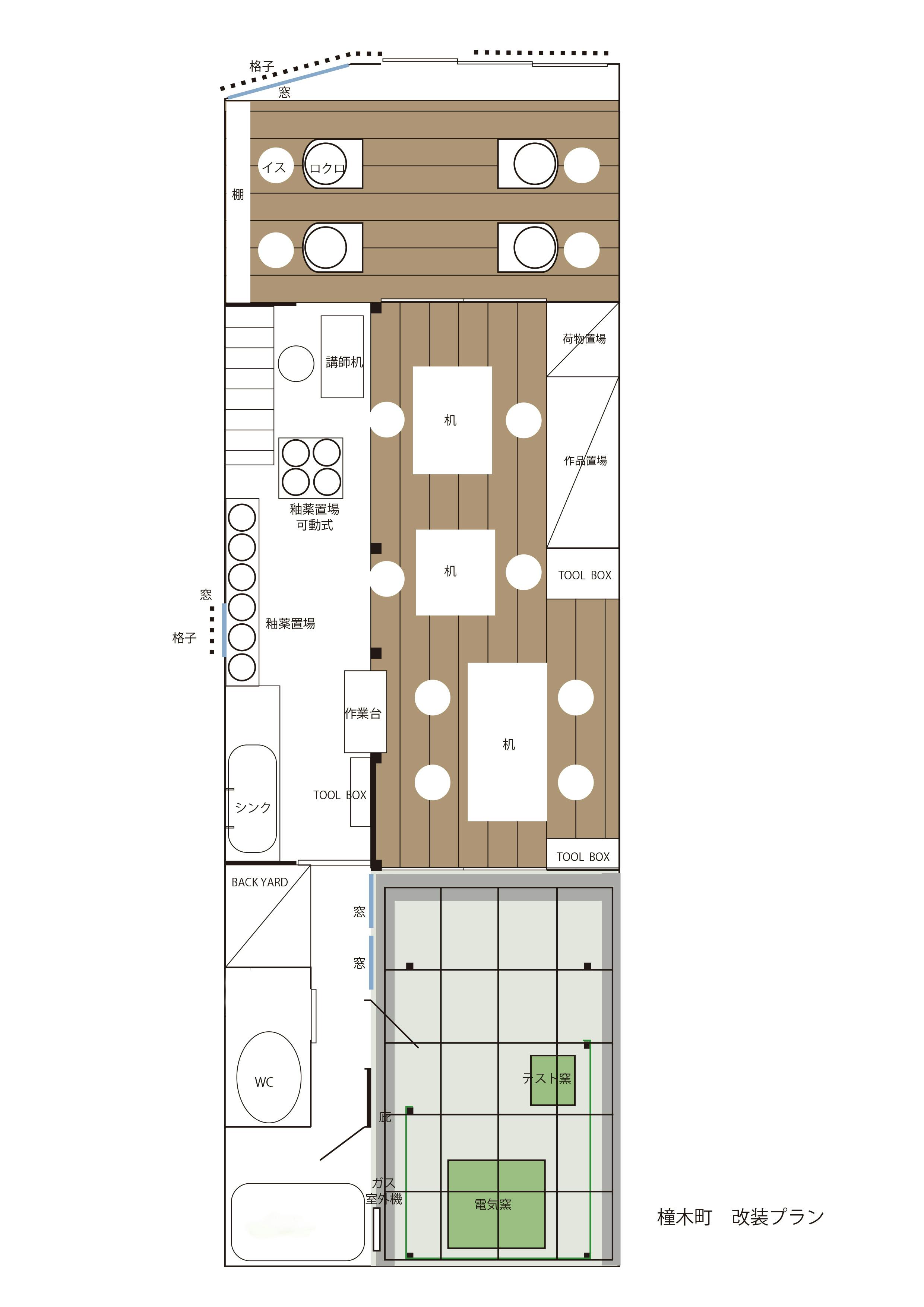4台もしくは5台の電動ろくろと複数の作業台。小さな裏庭部分に小屋を建て電気窯を設置します。できればテスト窯のようなサイズのものを合わせ2基設置したいと考えています。