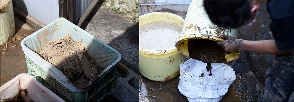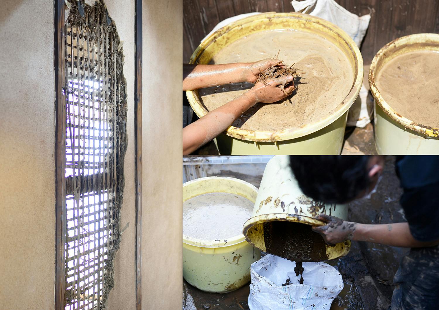 取り壊した室内の土壁は藁などを取り除き、アトリエの壁面タイルとして再生させます。