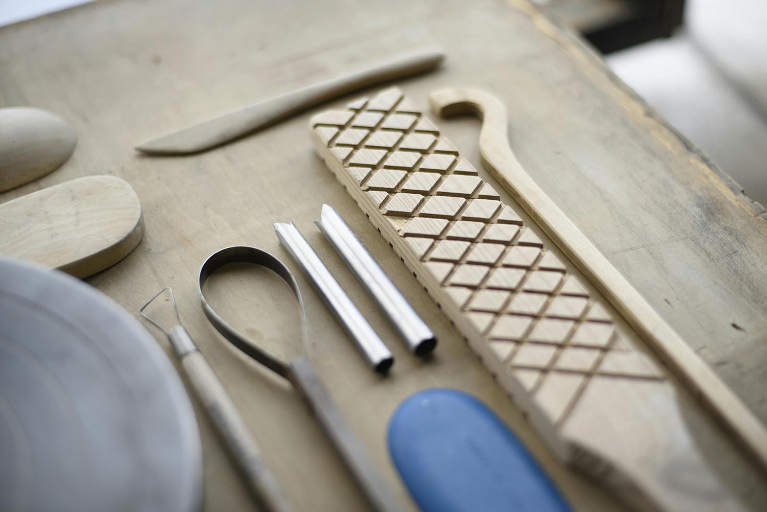 タタラ作り用の型、手回しろくろ、下絵の具。こじんまりとした空間なので定員は7名と少なくし、落ち着いて制作していただけるようにしていきます。