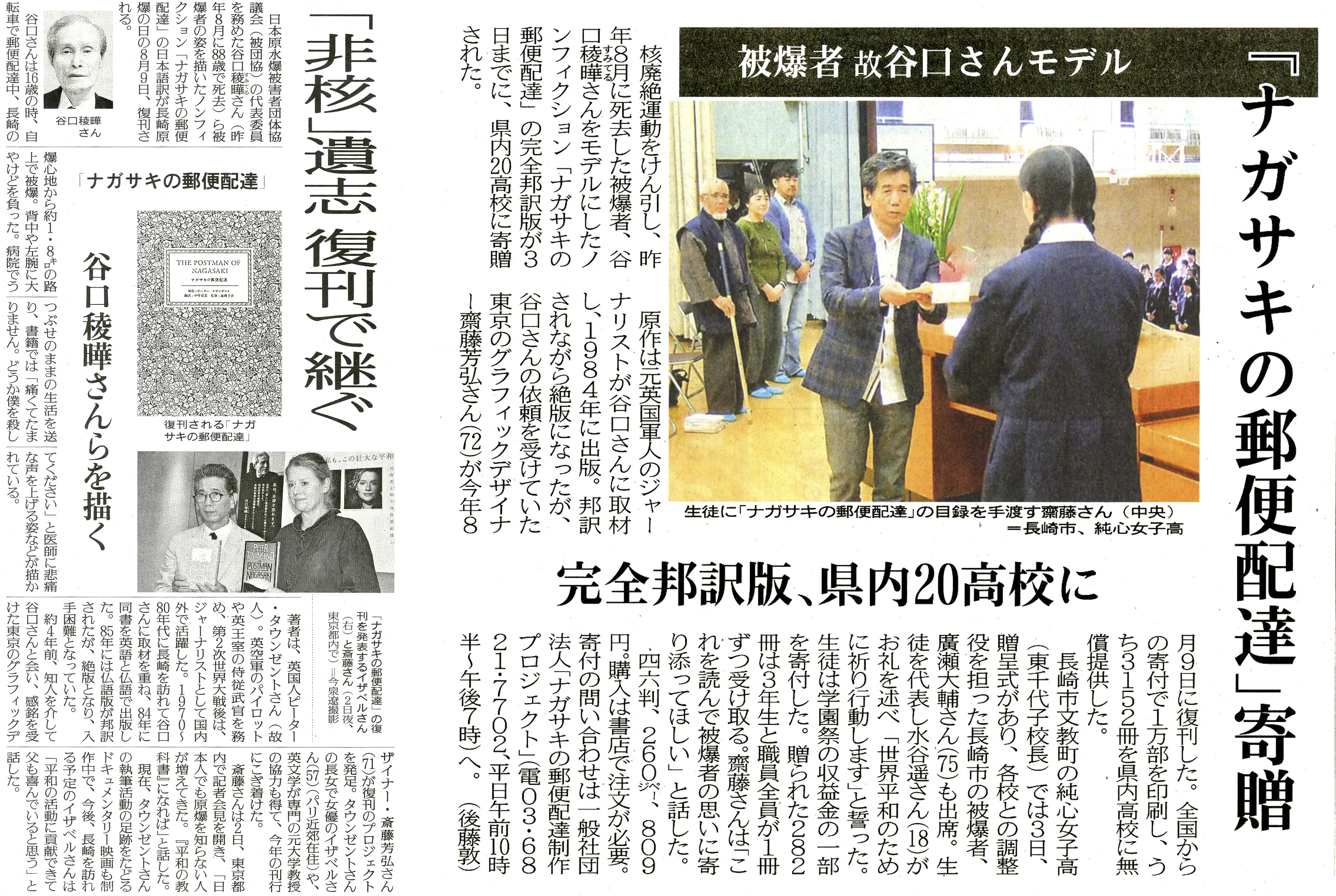 長崎市内21校に本書を寄贈した様子を伝えた長崎新聞。
