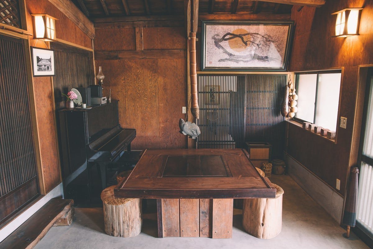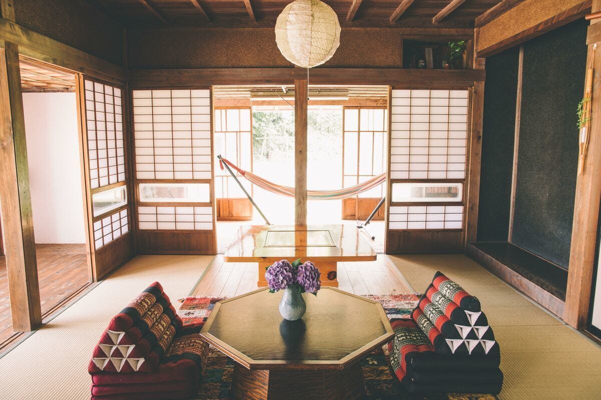 ゲストハウスの魅力は、周りを自然に囲まれた「静かな空間」と、古民家ならではの囲炉裏や梁(はり)などの「趣ある造り」です。