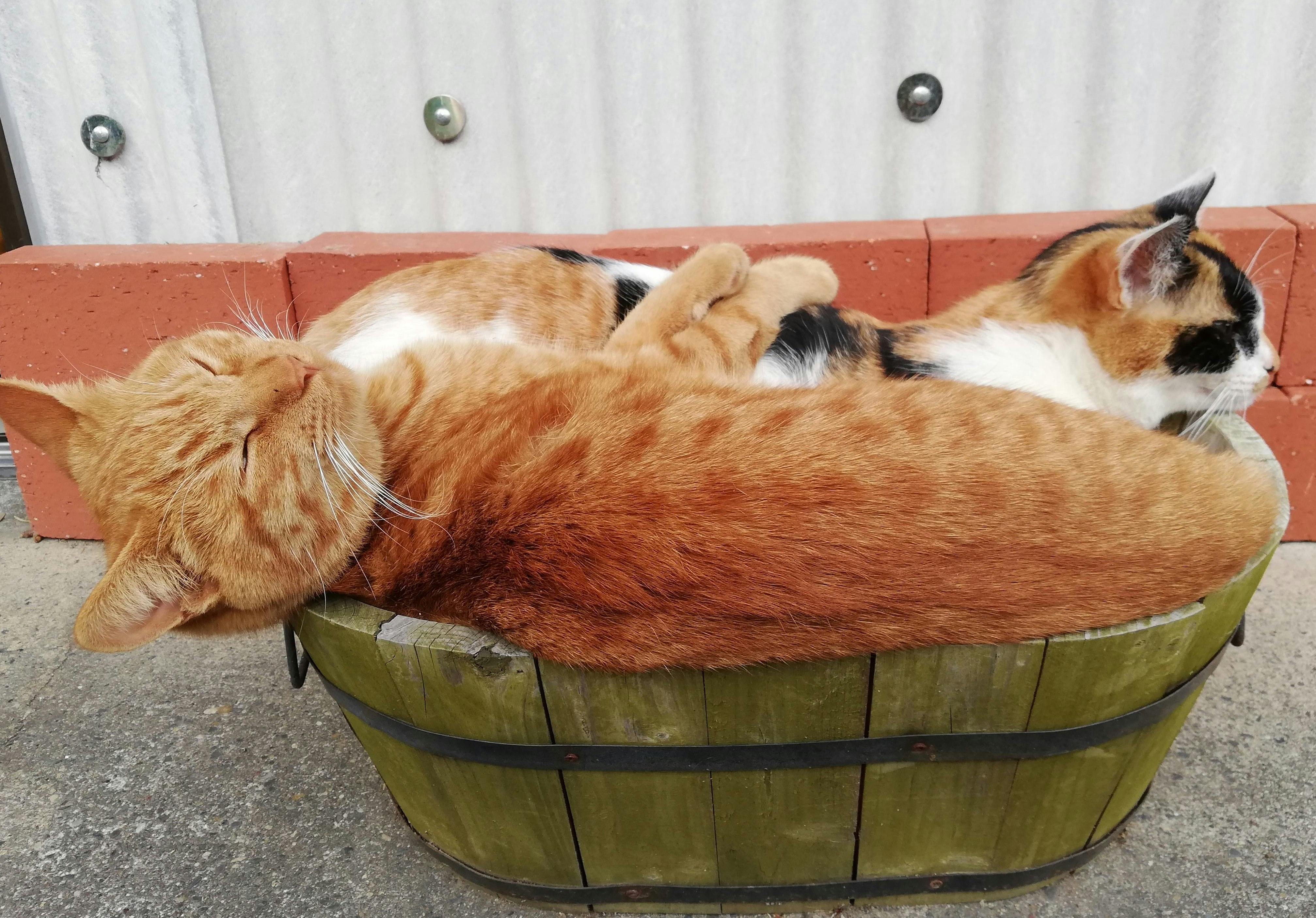 2匹の猫(「うめ」と「ぶん」)がいます。機嫌が良ければ触ることができます。