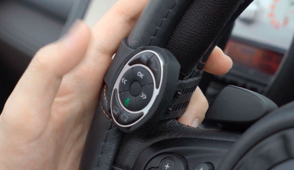 ステアリングにバンドで簡単に取り付けできるので、ステアリングを離さずに操作が可能です。もちろん音声アシスタントの呼び出しもリモコンのボタンで一発。