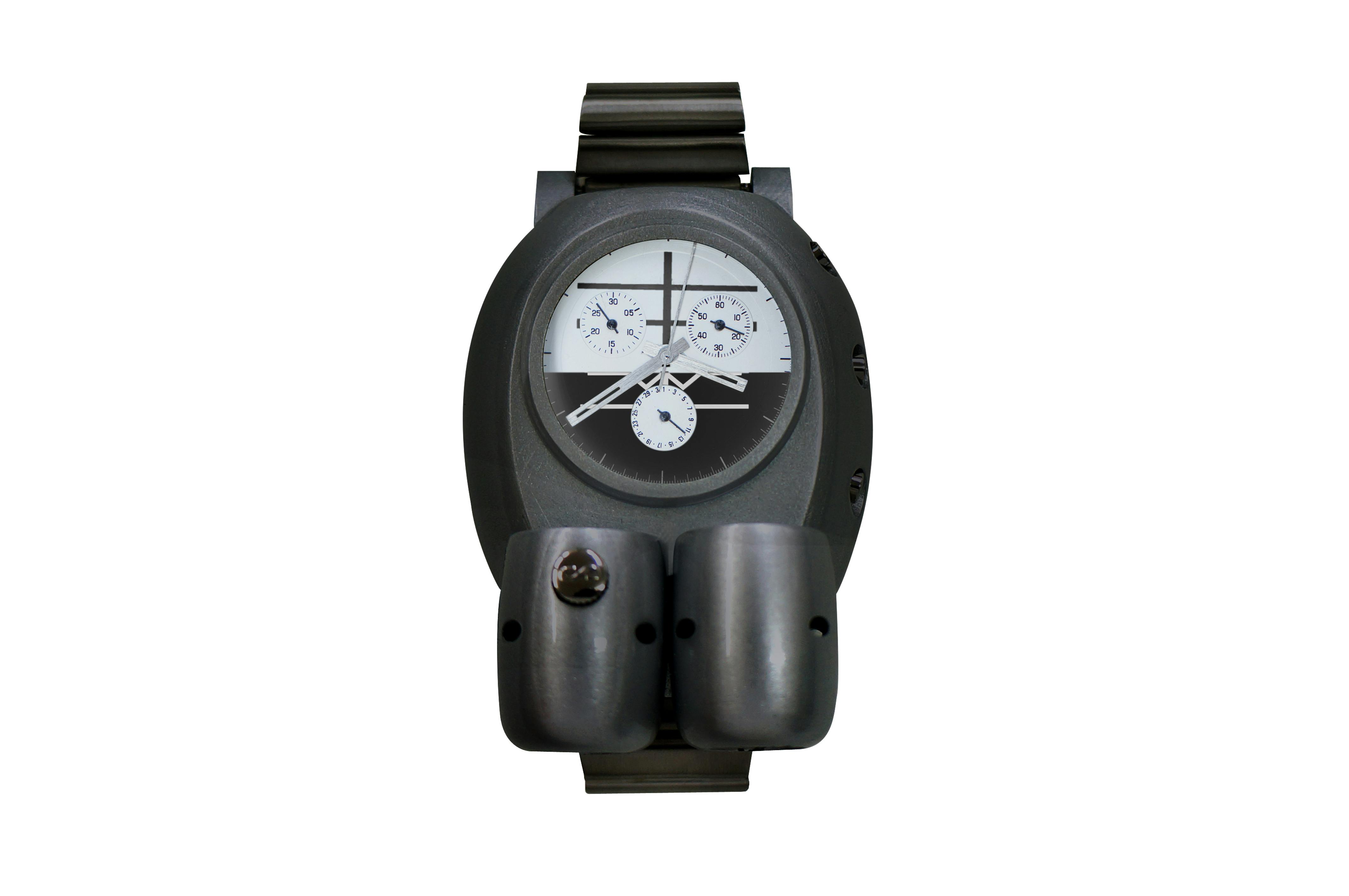 印象的な形状だけでなく、機能性も取り入れたく、クロノグラフをメインのウォッチ機能に使用。またプラス機能として、サブユニットにてセカンドタイムと温度計を付加しました。