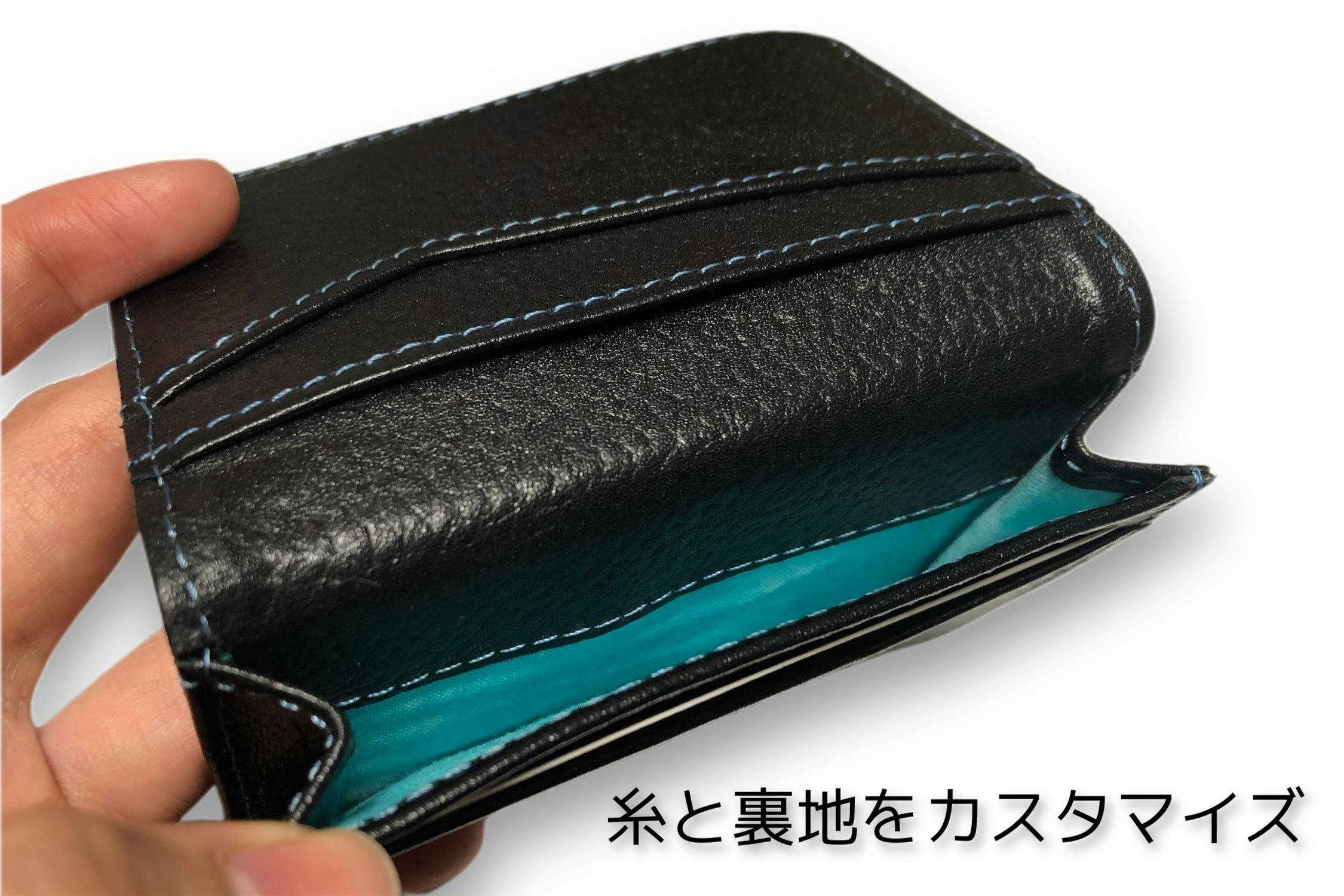 今回の名刺入れは表面が黒一色で、先方にも不快感を与えないデザインですが、縫い糸(ステッチ)が<黒・赤・水色・クリーム色>の4色と裏地が<赤・水色・薄ピンク>の3色からお選びいただけます。