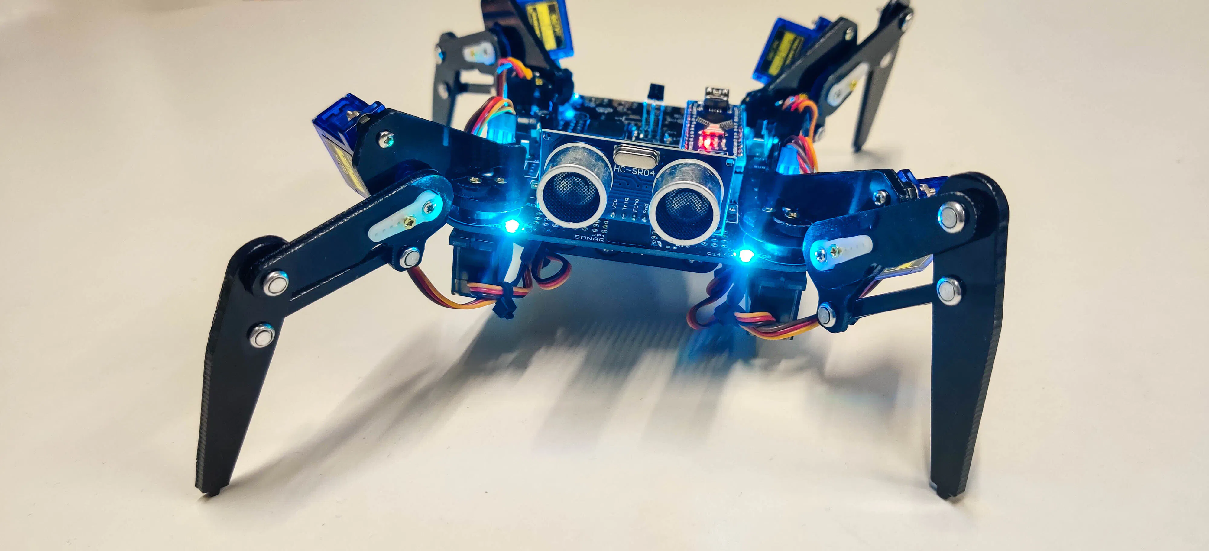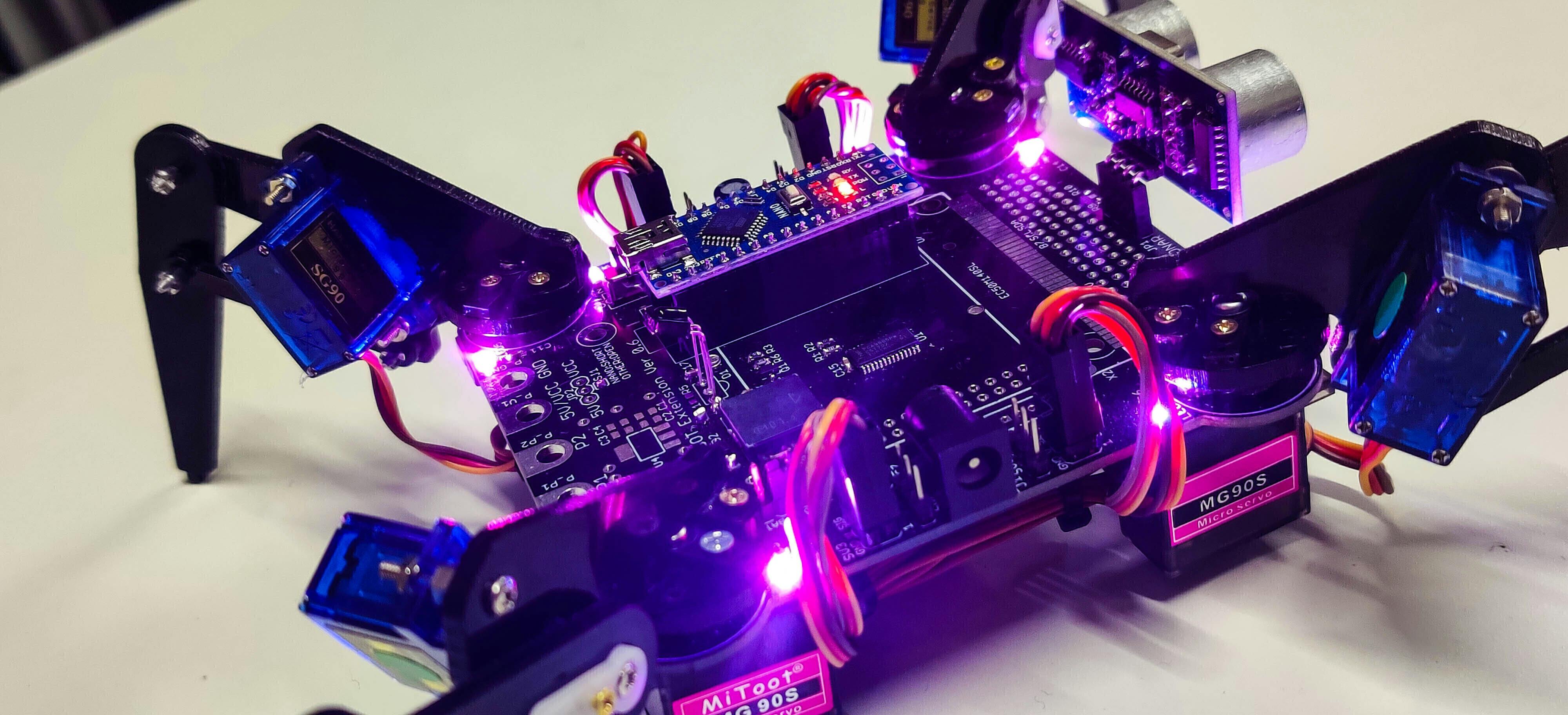 歩行システムを自分でイチから組み立てることにより多脚構造の理解や、サーボモータを使用し相互のバランスを崩しながら歩行する制御方法が学べます。