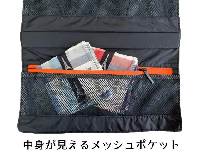 それぞれのコンパートメントはメッシュ素材で視認性も抜群! どこに何を収納したか一目瞭然で探す時間を省いてくれます。