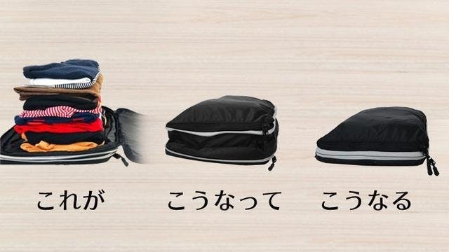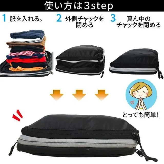 On the GO圧縮バッグを使えば、ファスナーで衣類を圧縮することでスーツケース内の衣類スペースを50%節約することができます。ファスナーで衣類を圧縮するので非常に簡単で使いやすいです。パッキングが苦手な方にオススメのアイテムです。