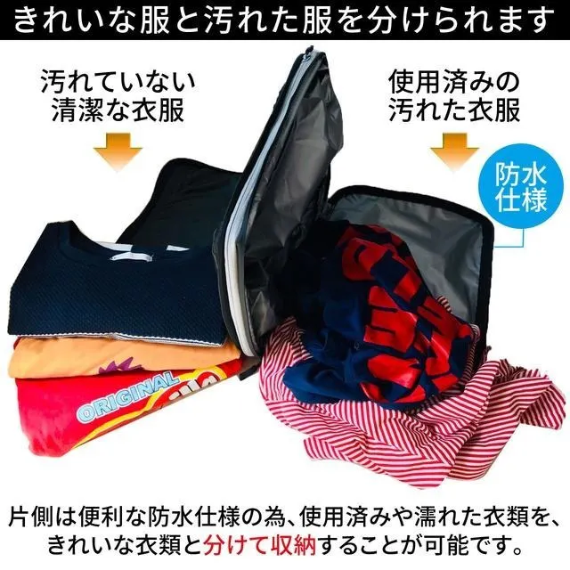 衣類を圧縮できるだけでなく、2つのコンパートメントに別れており、1つに綺麗な衣類、もう一つに着用済みの汚れた衣類を収納できます。スーツケース内で綺麗な衣類と汚れた衣類が混在することを避けることができます。
