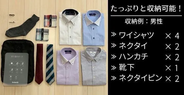On the GOバッグはワイシャツやネクタイをシワなく綺麗に収納するバッグです。旅先でもパリッとしたシャツでお仕事に臨んだり、ドレスアップして観光することができます。