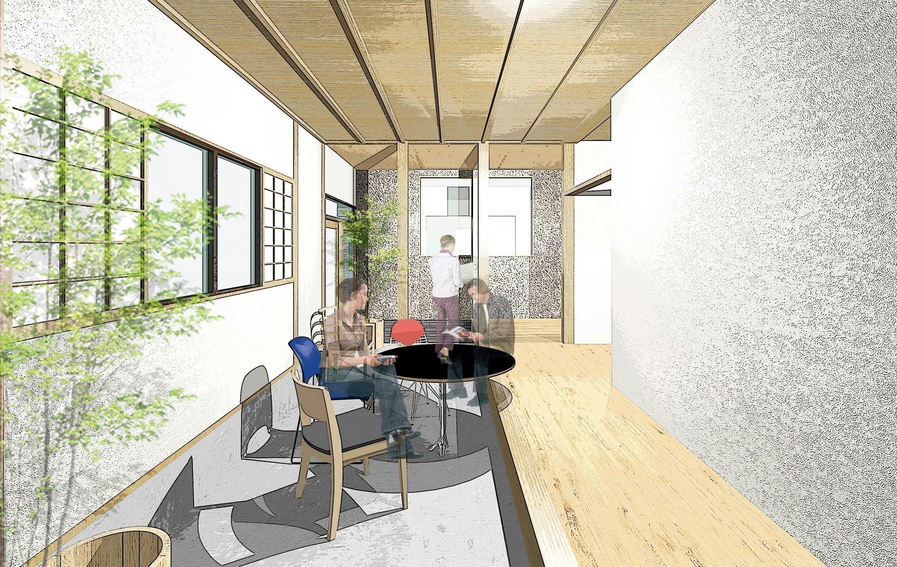 1階の仕様は、エントランスを入ってすぐ右部分にラウンジを設け、宿のお客様だけではなくタップルームにお越しのお客様とも交流ができるようなスペースにしたいと考え、誰でも気軽にくつろげる小上がりの縁側をイメージしました。