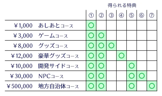 支援するコースによって得られる特典が異なりますので、上記の表でご確認ください 。