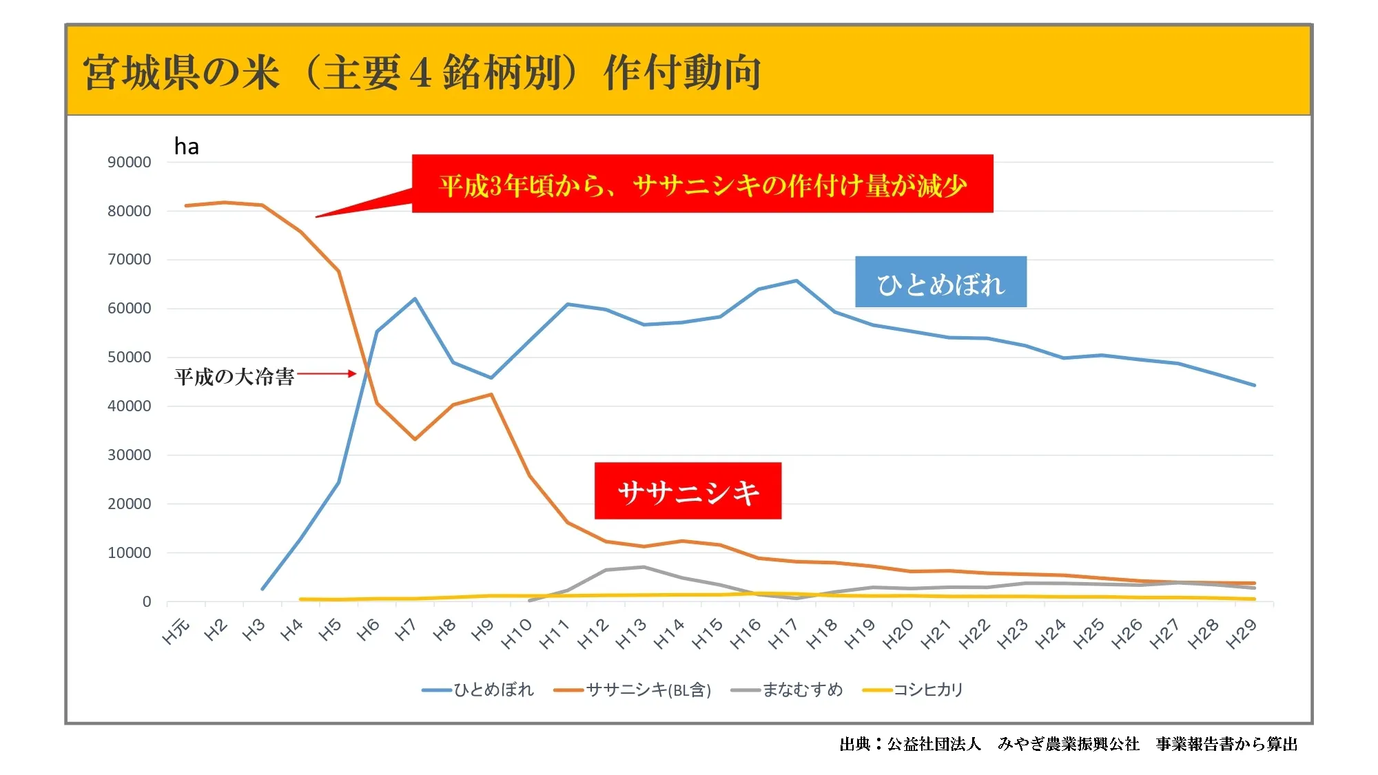 - ①平成の大冷害で多くのササニシキ農家に被害
