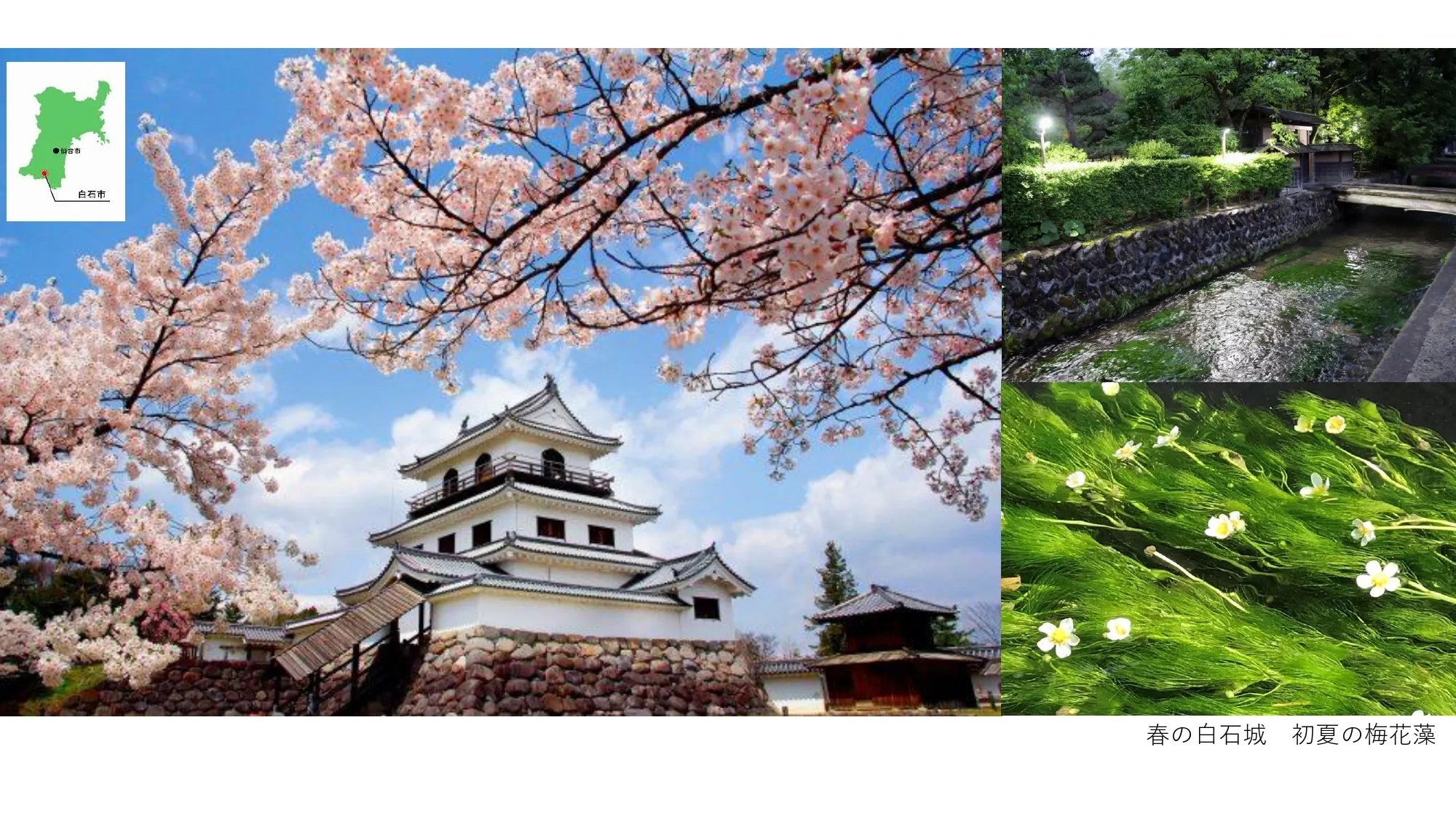 白石市は、宮城県と福島県の県境にあり、宮城県の玄関口にあたります。片倉小十郎の居城である白石城があり、蔵王連峰からの雪解け水が市内に流れ込む自然豊かな城下町です。市内を流れる沢端川(映画「ラストレター」の舞台)には、清流でしか育たない「梅花藻(ばいかも)」が育ち、せせらぎの音とともに、目や耳を楽しませてくれます。