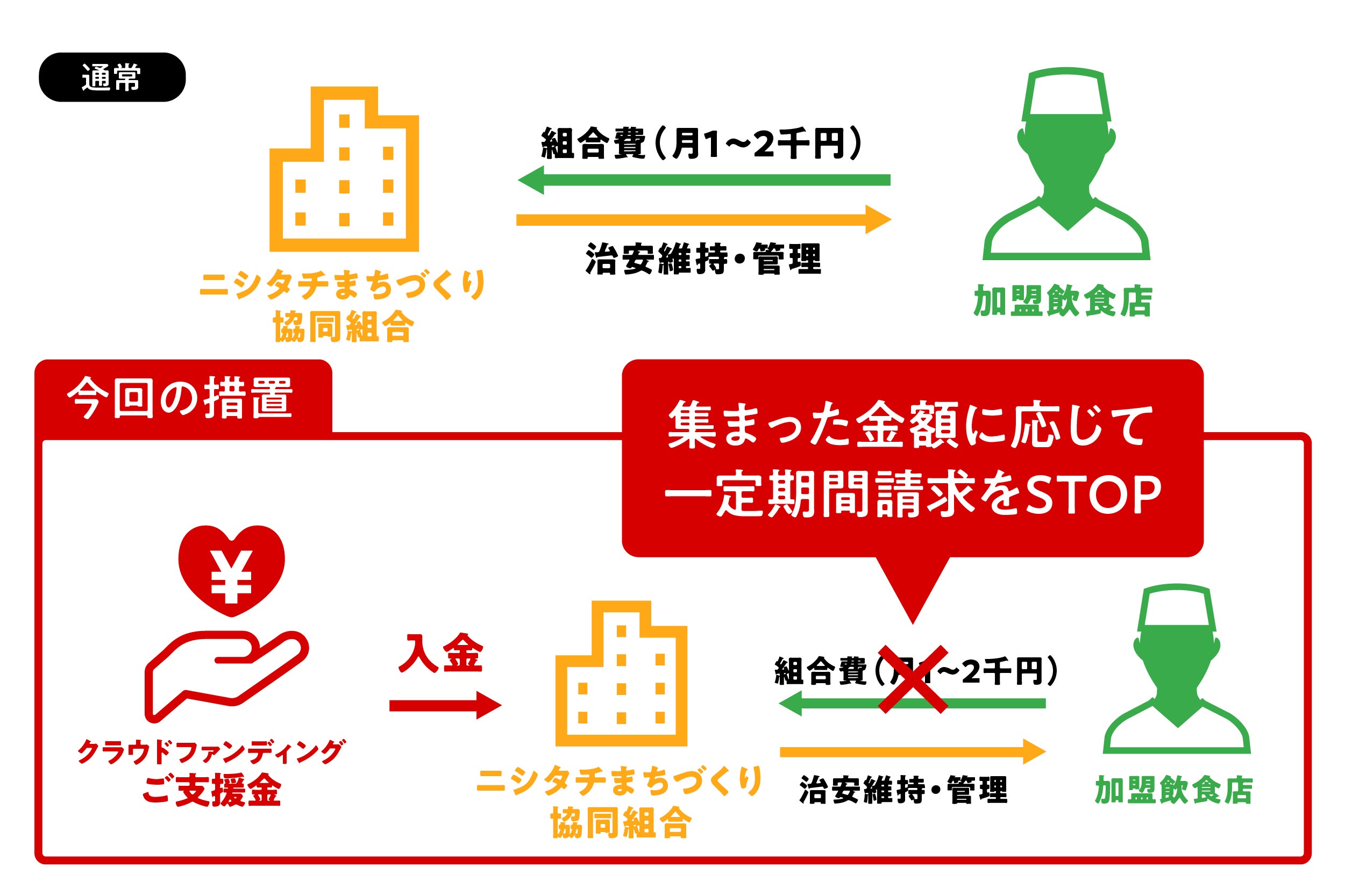 今回のプロジェクトで集まったお金はニシタチの店舗の経営負担をかるくするために、「ニシタチまちづくり協同組合」に収め、振興会費として街の維持管理にあてようと考えています。これにより月に1-2千円かかっている商店街の組合費負担が一定期間なくなります。