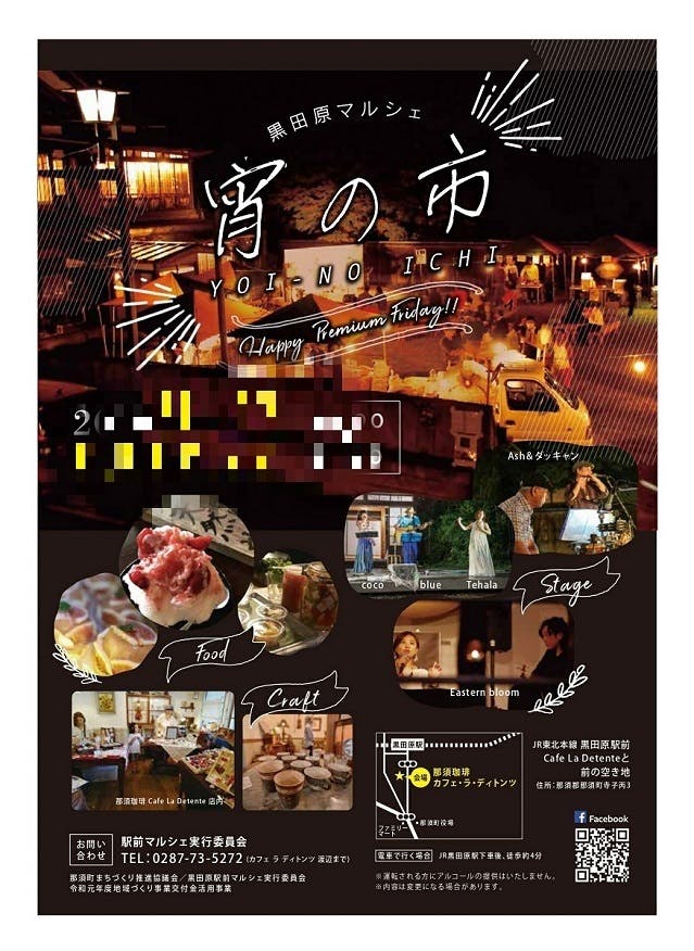 那須の活性化と黒田原駅前活性化を目的に開催している『宵の市』!お洒落な街をアピールする為に素敵な空間、素敵な演奏、素敵なクラフトさん、地元や県外の美味しいお店に拘って3年間開催してまいりました。