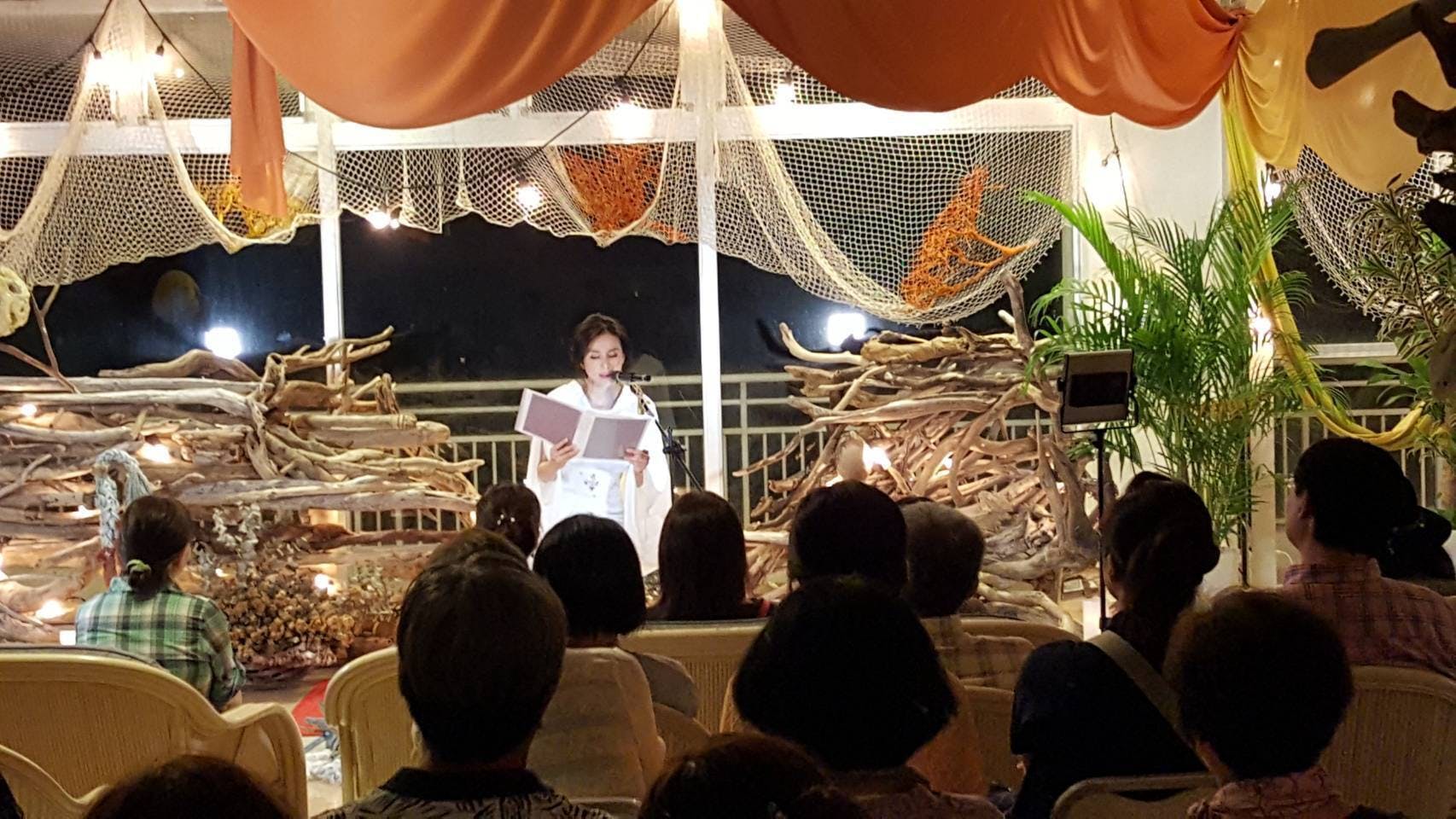 また【流木ホテル】と題し、ロビーにはイルミネーションを付けた流木アートを展示。昼は海と流木アートを楽しめ、夜はイルミネーションでロマンチックな空間を演出。地元産のフルーツを楽しめるミニBARを運営。流木ホテルのイベントのオープニングには、女優の杉本彩さんをお迎えし、ホテル周辺に伝わる”昔話”の朗読会を開催し、好評を得ました。