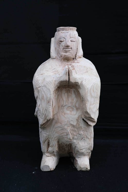 丸太の段階から、ノミやチェーンソーを使って仏像の形が彫り出されていきます。この仏像には明確な名前はありませんが、コロナ禍における「人々の平穏」を一心に願って彫りました。(メインで使っている画像が、その木彫り仏像になります。)