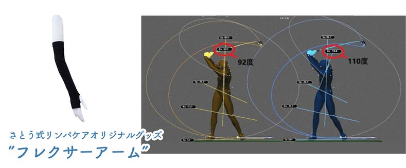 「フレクサーアーム」はさとう式リンパケアを基に開発したアームカバーで、装着するだけで筋肉の位置を正しく調整し、肩の可動範囲を広げます。スポーツ時にも有効で、ゴルフではトップを深くすることができます。