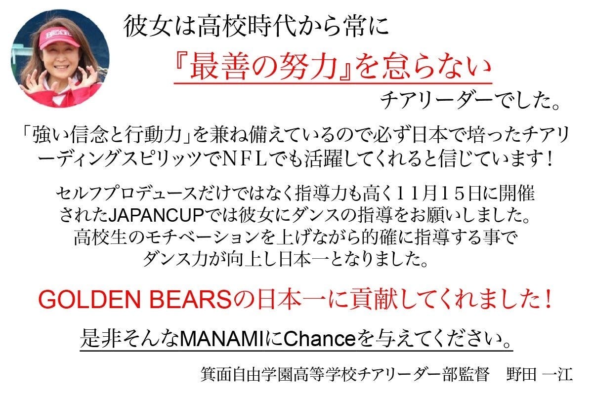 去年2019年12月に会社を退職し、全てをかけて今年2020年の2月に渡米をしました。そして本場アメリカでNFLチアチームの練習に参加をしておりましたが、コロナウイルスの為早期帰国することになり、異例のオンラインでのオーディションとなりました。