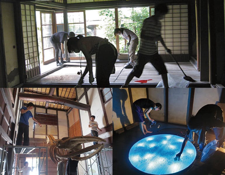 BIWAKO ビエンナーレでは、こうした残された貴重な建物の保存と活用を試みます。長年放置され続けた建物を、まずは、地元住民や日本全国から集まる有志たちの手で清掃することから始め、国内外より集まるアーティスト達が、各々の空間を作品化していきます。