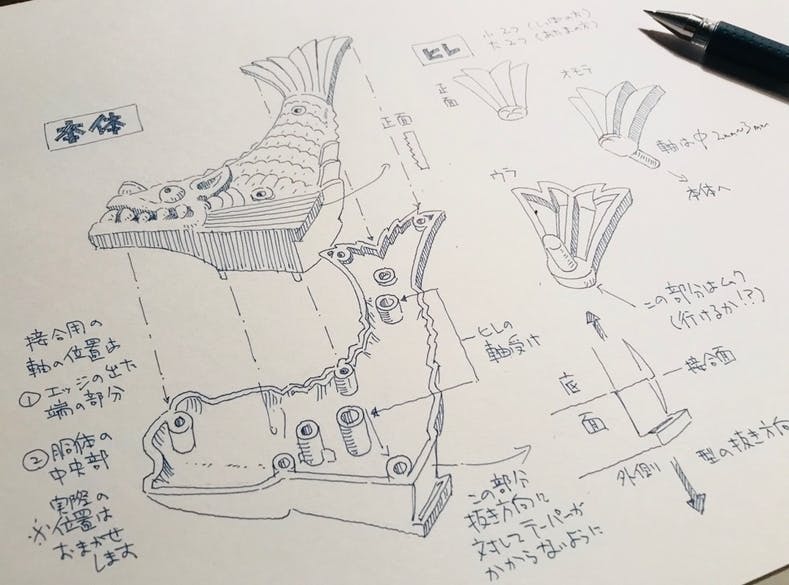 市場価格2,000円~3,000円程度の 城郭プラモデルをつくるには、相応の部品点数と、それを量産するための金型が必要です。専門メーカーに見積をとってみると、設計費と金型製造費で約1500万円が必要だとわかり、正直言って途方に暮れました。資金力はおろか、知名度も皆無の私たちですので、いきなり高額の目標額を掲げたところで失敗は目に見えています。そこで今回は最初のステップとして【小さいプラモデル=シャチホコ】をつくることにしました。