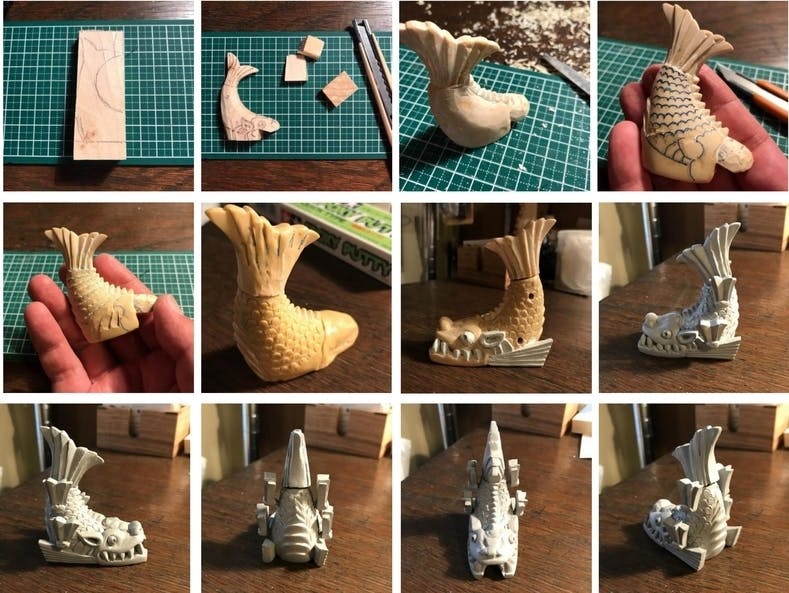 じつは、当初「お城のミニプラモを作ろう」という案もありました。しかし、これが仕上がってしまうと、私たちはそこで満足してしまって先に進めなくなるかもしれません。そんな考えから「お城に関係していながらお城とは異なるもの」としてシャチホコを選びました。ひと言でシャチホコといっても、じつはお城によって形も色も異なります。たとえば金色に輝く名古屋城のシャチホコは全体的にシャープで勇ましい造形ですが、尼崎城のシャチホコはどちらかというと魚の形をよく残していて、顔つきもどこか狛犬を彷彿させるようなユーモラスな雰囲気です。しかも、尼崎市立文化財収蔵庫には、実際の尼崎城で使われていたシャチホコが公開されています(現在工事のため休館中)。この特徴をきちんと捉えたプラモデルを作れるなら、これもまた尼崎城の発信につながると考えました。